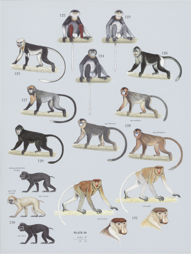 Douc and snub-nosed monkey species: 122) Red-shanked Douc (Pygathrix nemaeus), 123) Gray-shanked Douc (Pygathrix cinerea), 124) Black-shanked Douc (Pygathrix nigripes), 125) Tonkin Snub-nosed Monkey (Rhinopithecus avunculus), 126) Yunnan Snub-nosed Monkey (Rhinopithecus bet), 127) Guizhou Snub-nosed Monkey (Rhinopithecus brelichi), 128) Golden Snub-nosed Monkey (Rhinopithecus roxellana), 129) Stryker’s Snub-nosed Monkey (Rhinopithecus strykeri), 130) Pig-tailed Langur (Simaas concolor), 131) Proboscis Monkey (Nasalis larvatus)
