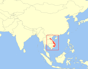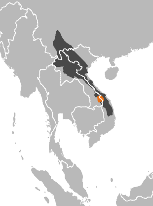 Giant muntjacs are primarily found in the Annamite Mountains on the border of Vietnam and Laos, but they also been found in Mondulkiri province of Cambodia, and in Annam, as far south as the Dalat Plateau. Along the mountains, antlers of giant muntjacs have been found in villages as far north as the Chat River and as far south as the village of Dakchung, although the true extent of its range is still unknown. /=\
