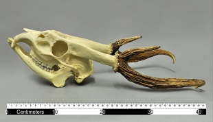 Although the general dimensions of giant muntjacs are not unique, there are four features that separate these animals as a species: short/stout pedicels, size and conformation of antlers, skull characteristics (length and shape of nasals), and a triangular tail. Antlers in males are larger than those of any other muntjac. They grow up and backward, with forking that creates a brow tine. Measured antlers had bean lengths of 17 to 28.5 centimeters (6.7 to 11.2 inches) and the brow tines were up to 9.8 centimeters (3.8 inches) long. The pedicels are very prominent and extend along the face as ridges. /=\