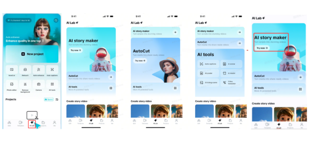Start the CapCut App and head to the "AI Lab" section via the bottom menu. Here, you’ll find "AI story maker", "AutoCut", and other time-saving "AI tools". Pick the "AI story maker" and click on "Try now" to start building your testimonial video.