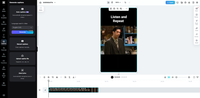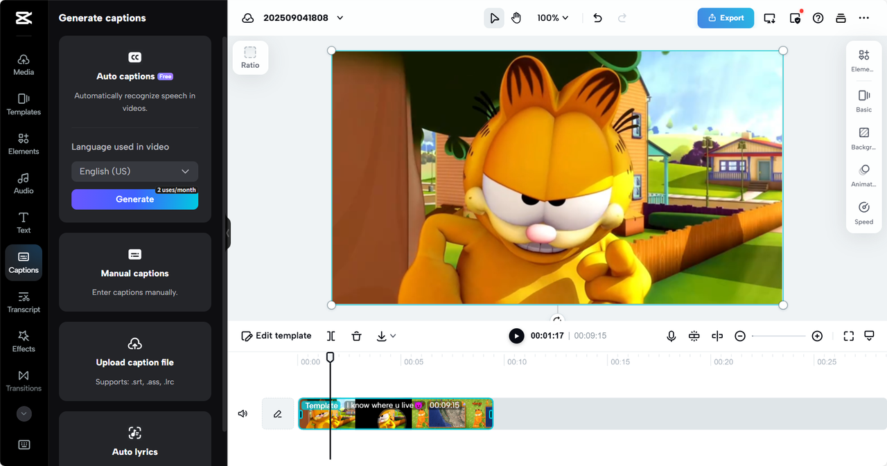 Right-click on the left menu button titled Captions. You have the choice to add manual caption, generate auto captions, upload caption file, or auto recognize lyrics. Select "Auto captions", set the language, then click "Generate". Once captions appear, you can curve text, adjust font, and reposition them as needed.