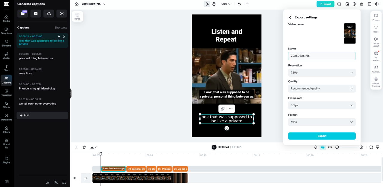 Once content, click the Export tab in the upper right-hand corner. Then press download to define your file name, resolution, quality, frame rate, and format. Lastly, click on export so that you can have your curved-caption video ready.