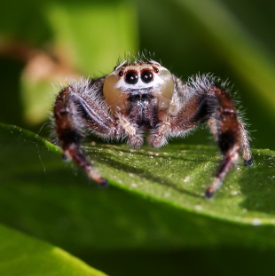 According to National Geographic Bold jumping spiders (Phidippus audax) have iridescent colorations on their jaws and an inquisitive nature. They don’t spin webs but rather seize prey by ambush. Photographer Javier Aznar said these spiders, which can be found throughout North America, seemed “friendly,” and were not fearful of him. A few jumping spider species also have excellent color vision, so when they turn that puppy-dog gaze your way, they’re actually seeing you. [Source: Jason Bittel, National Geographic, February 8, 2023]