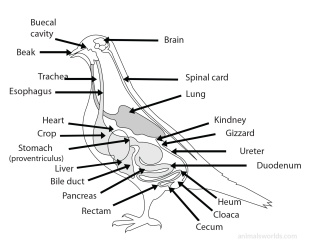 Food passes through the mouth into the gullet and then the crop, a thin-walled pocket that is used to store food for later digestion or regurgitation for feeding young. The crop is especially well pronounced in grain-eating birds. The gizzard is the avian equivalent of a stomach. It is connected to the intestines. Bird have no urinary tract. Nitrogenous wastes is excreted in the form of urea through an opening called the cloaca.