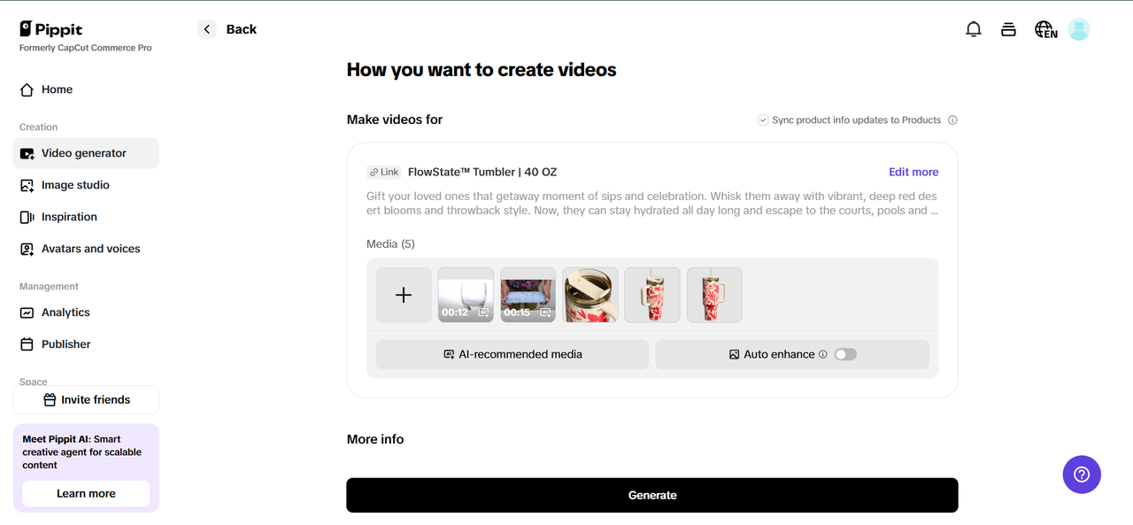 Not all founders can afford a high-quality video production crew or have the time to learn video editing tools. AI video generators such as Pippit are making it a level field by: