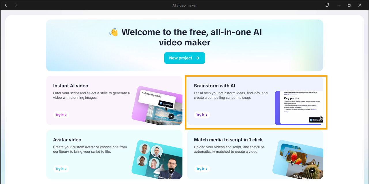 On CapCut PC, open AI Video Maker from the menu. Then choose Brainstorm with AI on the toolbar.