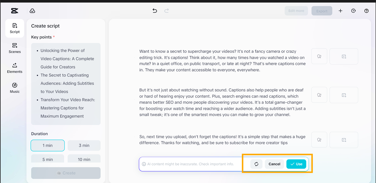The videos become easier to follow because of captions, and the explanations are made clear with the help of voice-over lines, keeping the viewers engaged. The positive side is that it is possible to save a lot of time using CapCut PC AI Writer.