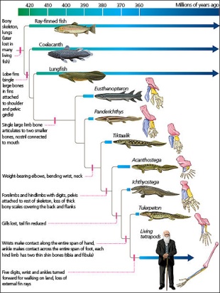 Tetrapods (four-limbed animals with a backbone that eventually moved out of water and onto land) that lived 350 million years ago belong to the ancestral group that led to the human lineage. One tetrapod,,Tristichopterids, found in the fossil record, disappeared in a mass extinction event at the end of the Devonian, Period about 359 million years ago. They have no direct descendants today, but researchers think that a common ancestor with our ancestral lineage existed earlier in the Devonian.