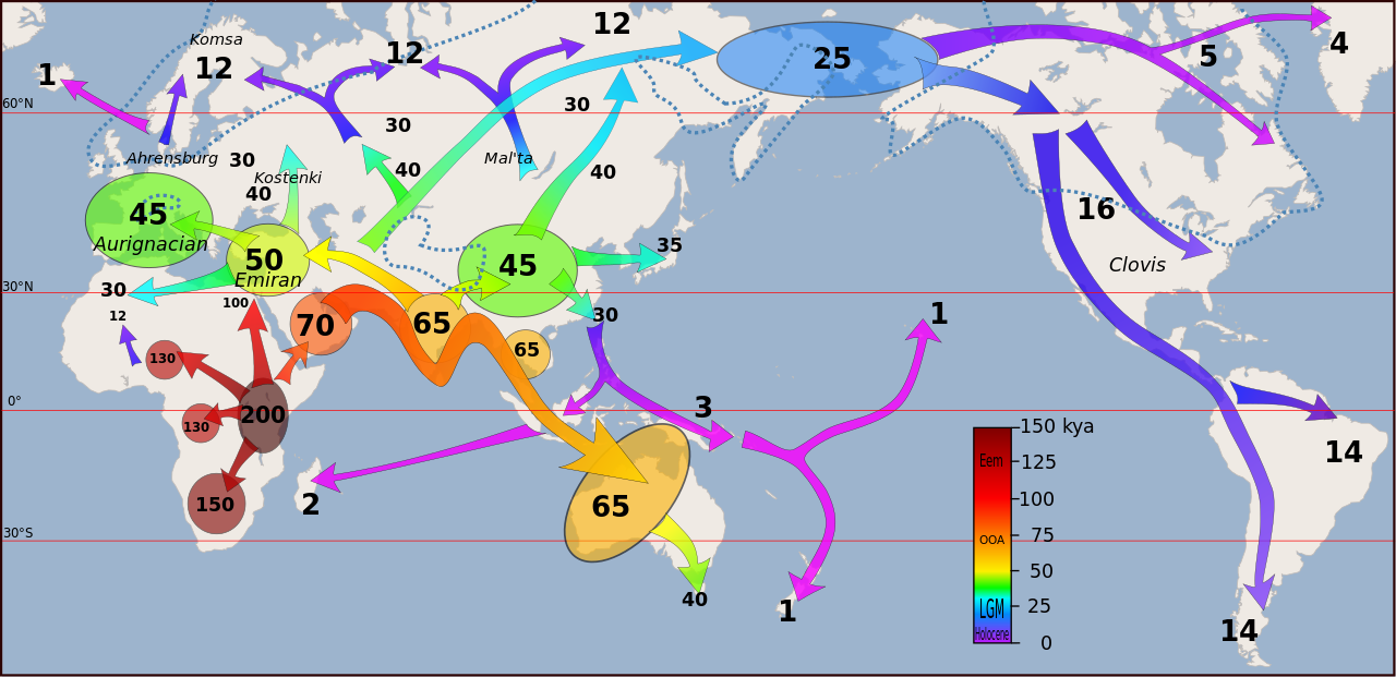 Guy Gugliotta wrote in Smithsonian Magazine: “About 100,000 years ago, modern human beings started spreading out from their initial homeland in Africa to occupy Europe, Asia and, by sea, even Australia, displacing or absorbing Neanderthals and other archaic hominin species. That diaspora took about 70,000 years, and when it was completed our ancestors stood triumphant. [Source: Guy Gugliotta, Smithsonian Magazine, February 2013 /||]
