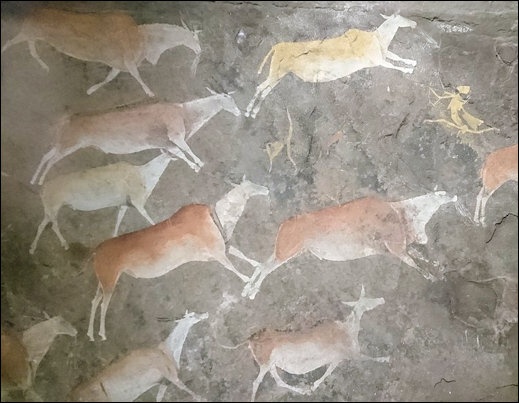 As to the age of the Bushmen paintings, some anthropologists say that because they were exposed to the air (unlike the European paintings which were often found in nearly sealed off caves) the colors were unlikely to last more than a 1,000 years. Most are probably between 300 and 800 years old. Some of them show Bantu and their cattle. Others depict European soldiers with guns and horses that were painted between 1820 and 1870.