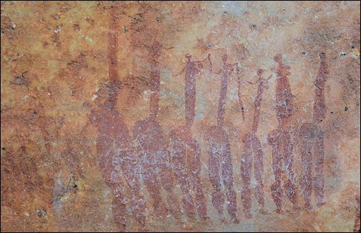 The Bushmen paintings depict figures playing reed flutes, escaping from ambushing leopards and dressed in knee-length cloaks. A figure in one cave had hooves instead of feet. In another they had heads and skins of buffalo. Anthropologists speculate these images might carry a religious message.