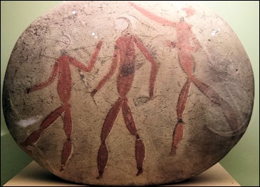 According to the Metropolitan Museum of Art: “This small polychrome stone, found buried with a human skeleton near the Lottering River in the southern part of the Western Cape province of South Africa, is famous not only for its great age but also its beautiful and unusually well-preserved imagery. Three figures with white faces and vibrantly elongated ocher bodies stride across this round stone's surface. [Source: Department of Arts of Africa, Oceania, and the Americas, The Metropolitan Museum of Art, \^/]