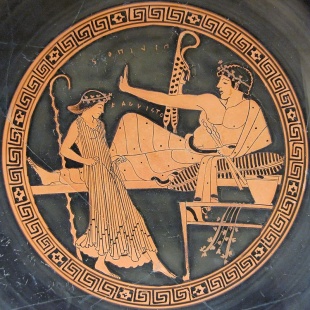 “Other women who often attended symposia were hetaera, courtesans who became the regular companions of men who could pay for their services. They dazzled the men with their beauty and entertained them with their wit and refined conversation. The symposium gave them the opportunity to show off their charms and meet generous protectors. There were no illusions about their role in the proceedings. Athenaeus recounts that when some young men fought for the favors of a hetaera called Gnatena, she consoled the loser saying, “Cheer up lad, it is not as if you were fighting for a crown, just for the obligation to pay.”