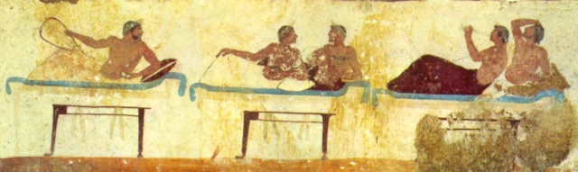 “The feast itself was the prelude to the evening’s real purpose. Once appetites were sated, the slaves carried away the tables, tidied up the room, and replenished the wine jug, or krater, so the symposium itself could begin. A certain amount of revelry was expected, even demanded, but there was much debate over where high spirits crossed into boorishness. A fourth-century poet, Eubulus, observed that the behavior of diners could be kept within bounds if they limited themselves to only three servings of wine.