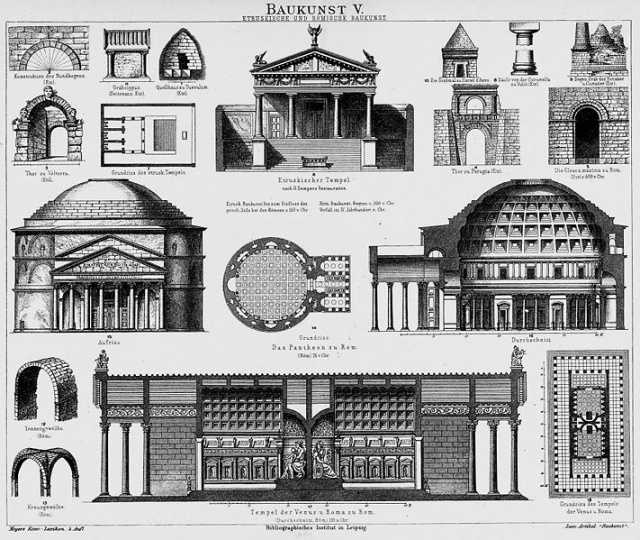 “Hadrian’s architectural passions were the high point of the “Roman Architectural Revolution”, 200 years during which a genuinely Roman language of architecture emerged after several centuries of slavish copying of the Ancient Greek originals. At first the use of such novel materials as concrete and a newly rigid lime mortar was driven by the empire’s expansion, and the consequent demand for new large, practical structures – warehouses, record offices, proto-shopping arcades – easily and quickly put up by unskilled labour. But these new building types and materials also provoked experimentation – new shapes, such as the barrel vault and the arch – acquired from Rome’s expansion to the Middle East. ==