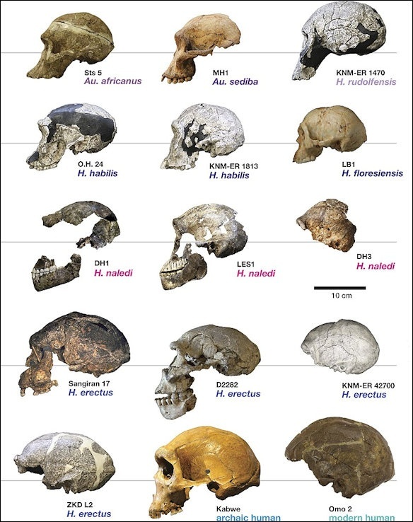 The small hominins found on Flores stood only three feet tall and weighed only 55 pounds, about a third of the size of a modern human adult, and had brains considerably smaller than any other hominin, and even smaller than most chimpanzee adults. Their pelvis was wider than modern humans and homo erectus; their arms hung almost below the knees but their wrists bones were delicate implying that it was not a tree climber. The skull was pinched in at the temples like “ Homo erectus” skulls found in Dmanisi, Georgia.
